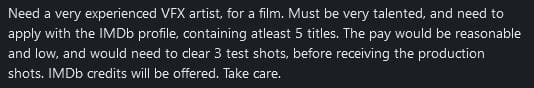 "Need a very experienced VFX artist, for a film. Must be very talented, and need to apply with the IMDb profile, containing at least 5 titles. The pay would be reasonable and low, and would need to clear 3 test shots, before receiving the production shots. IMDb credits will be offered. Take care."