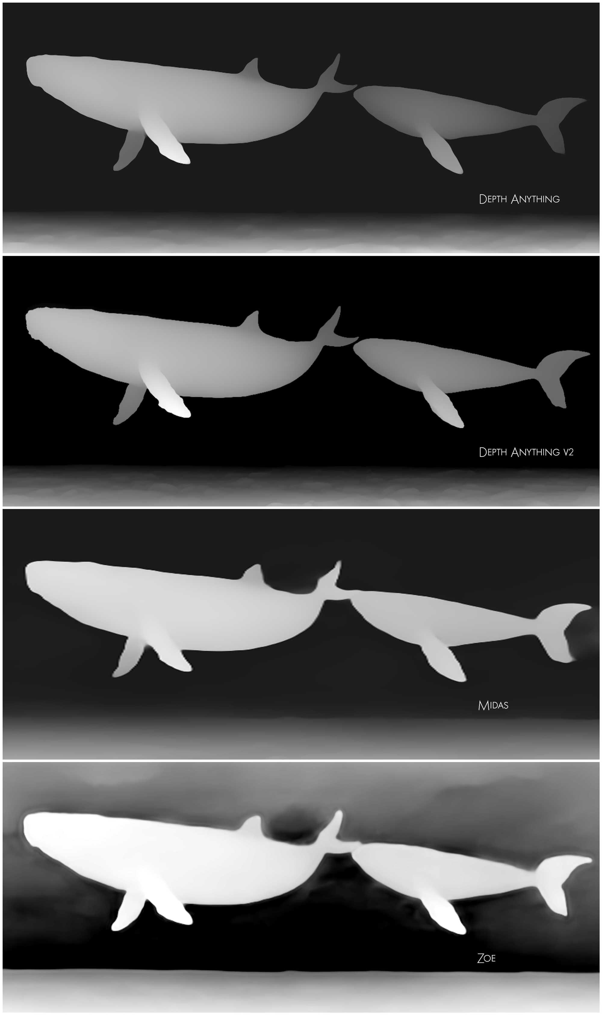 I've been running the same shot, that floating whale scene, through a few different models specifically designed for depth maps: “depth Anything,” “depth anything v2,” "MIDAS", and “Zoe Depth Anything.”