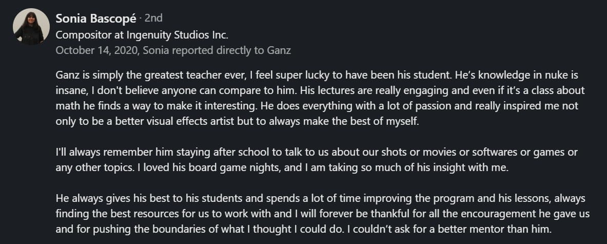 Ganz is simply the greatest teacher ever, I feel super lucky to have been his student. He’s knowledge in nuke is insane, I don't believe anyone can compare to him. His lectures are really engaging and even if it’s a class about math he finds a way to make it interesting. He does everything with a lot of passion and really inspired me not only to be a better visual effects artist but to always make the best of myself.