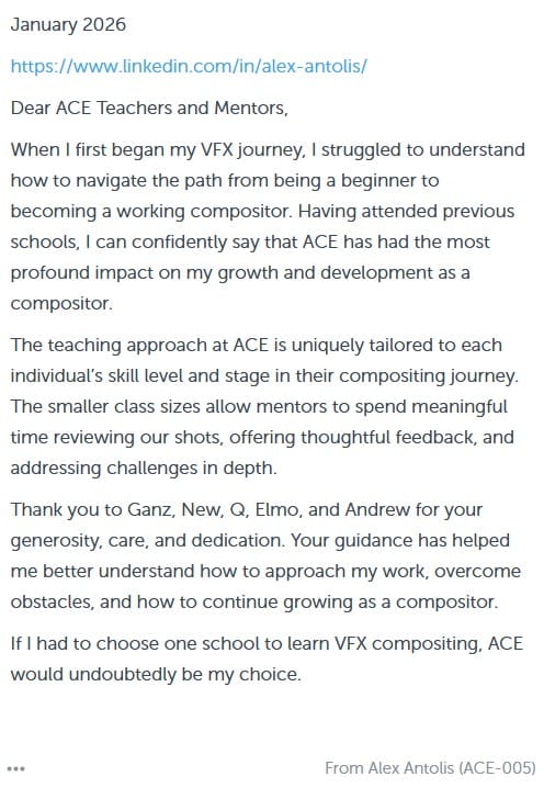 If I had to choose one school to learn VFX compositing, ACE would undoubtedly be my choice.