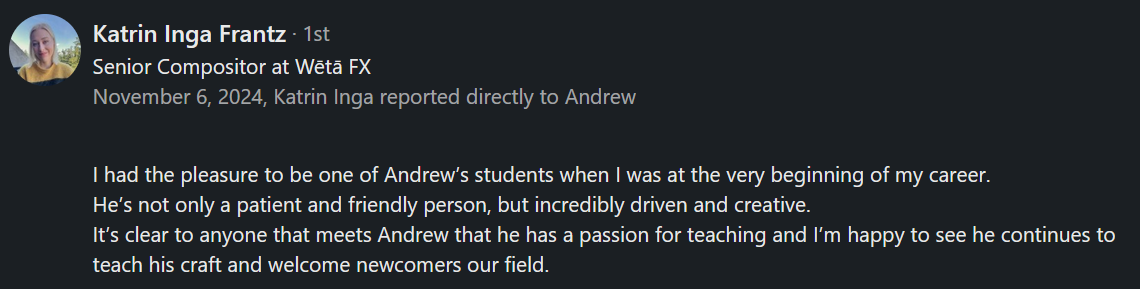 Here’s what Katrin Inga Frantz, now a Senior Compositor, had to say about our co-founder Andrew Zeller