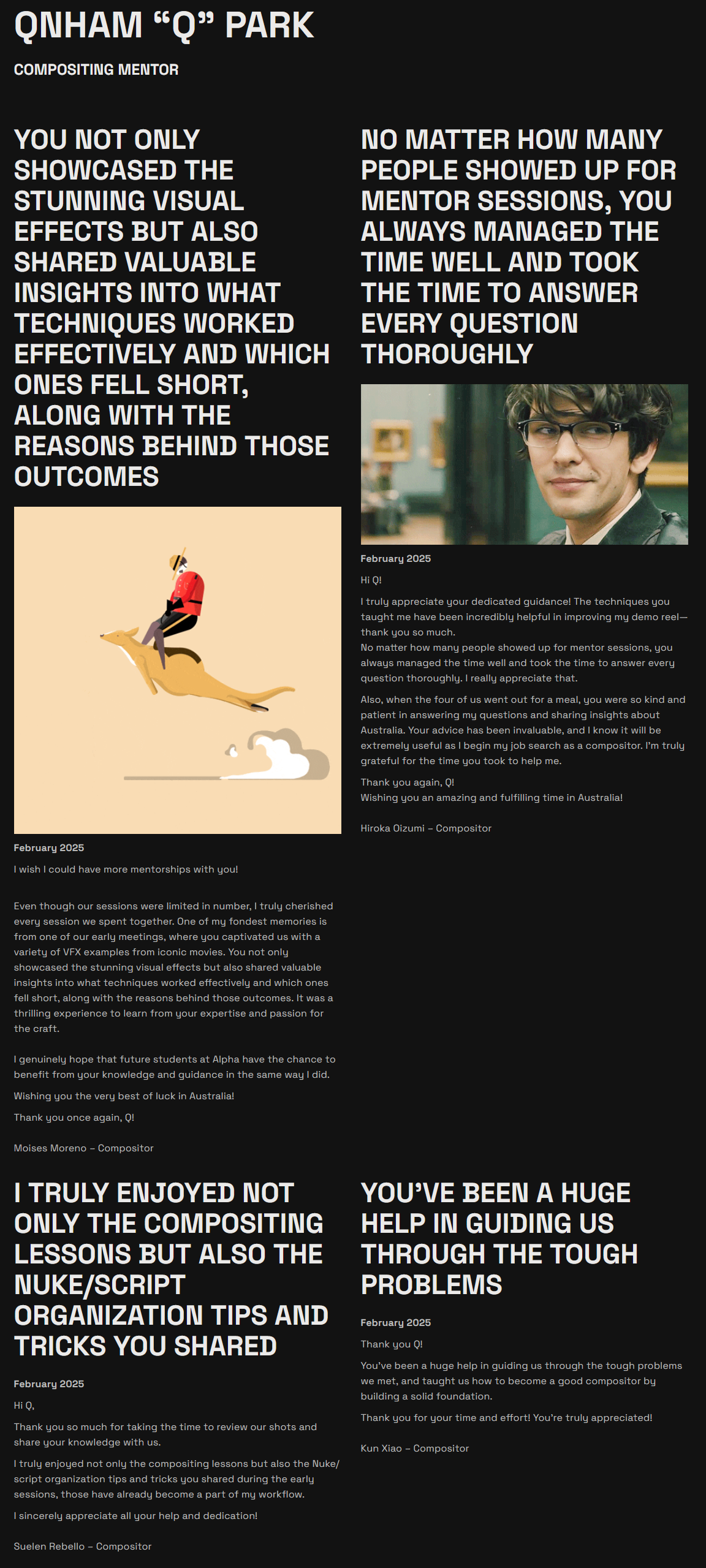 “You’ve been a huge help in guiding us through the tough problems we met, and taught us how to become a good compositor by building a solid foundation.”