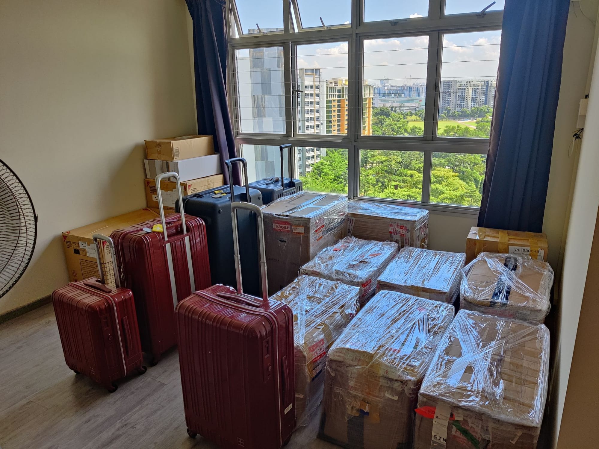 350 kg across the Pacific, now stacked by the window.
